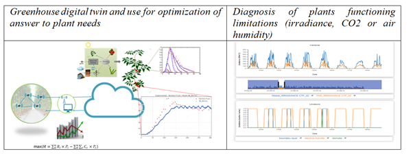 In previous works on greenhouse vegetables, developed greenhouse modeling solutions significantly improved crop management and yield estimation , including savings of 50-100€/ ha/day of CO2 (92% of CO2 cost) and a reduced emission of liquid CO2 of 90% on tomato crops, while yield and quality estimations on salad crops reached 90-95% of precision. This has already been done on field crops which do not require the management of so many management data and no need for quasi RT answer (an hour granularity is needed in the greenhouse compared to a few days in field crops). Thus applicability in greenhouses could be substantially increased by a more connected and more reactive “digital twin”, processing in quasi RT the meteorological data of the greenhouse (hourly to daily reactions depending on the actuators). The uncertainty would be strongly reduced by automated data assimilation and simulation iteration.